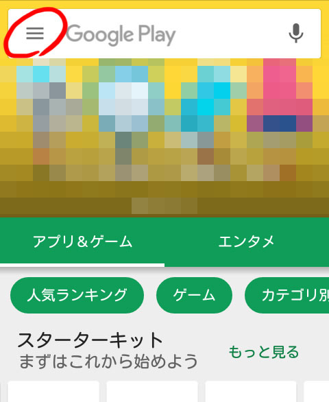 1:Playストアを起動し、左上のメニューボタンをタップします。